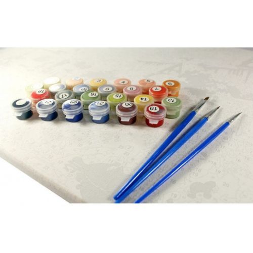 Картина за номерами. Для того, щоб намалювати картину, необхідно малювати за пронумерованими контурами, які відповідають кольору фарби. У наборі: полотно на підрамнику з галерейною натяжкою, паперовий дублікат з контурним малюнком картини (на картині нанесена схема контурів зображення з нумерацією), художні нейлонові пензлі, палітра акрилових фарб у контейнерах. Усі необхідні фарби вже в комплекті та не вимагають змішування. Розмір: 40х50 см.