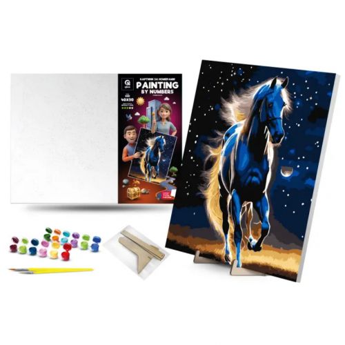 Картина за номерами з фарбами металік. Для того, щоб намалювати картину, необхідно малювати за пронумерованими контурами, які відповідають кольору фарби. У наборі: полотно на підрамнику з галерейною натяжкою, художні нейлонові пензлі, палітра акрилових фарб у контейнерах, деревʼяні деталі підставки для картини. Усі необхідні фарби вже в комплекті та не вимагають змішування. Розмір: 40х50 см. Рекомендовано для дітей старше 5 років.