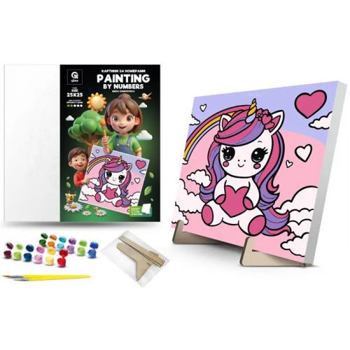 Дитяча картина за номерами. Для того, щоб намалювати картину, необхідно малювати за пронумерованими контурами, які відповідають кольору фарби. У наборі: полотно на підрамнику з галерейною натяжкою, художні нейлонові пензлі, палітра акрилових фарб у контейнерах, деревʼяні деталі підставки для картини. Усі необхідні фарби вже в комплекті та не вимагають змішування. Розмір: 25х25 см. Рекомендовано для дітей старше 5 років.