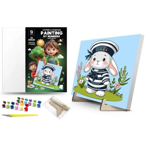 Дитяча картина за номерами. Для того, щоб намалювати картину, необхідно малювати за пронумерованими контурами, які відповідають кольору фарби. У наборі: полотно на підрамнику з галерейною натяжкою, художні нейлонові пензлі, палітра акрилових фарб у контейнерах, деревʼяні деталі підставки для картини. Усі необхідні фарби вже в комплекті та не вимагають змішування. Розмір: 25х25 см. Рекомендовано для дітей старше 5 років.