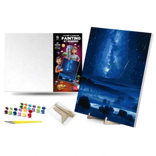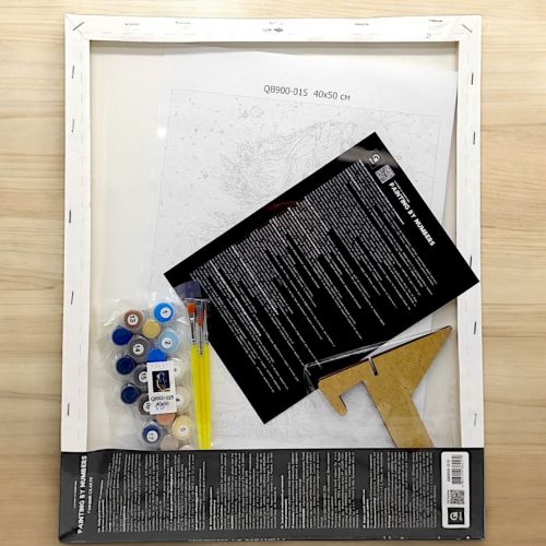 Комплектація: полотно на підрамнику з галерейною натяжкою, художні нейлонові пензлі, палітра акрилових фарб у контейнерах, дерев’яні деталі підставки для картини.