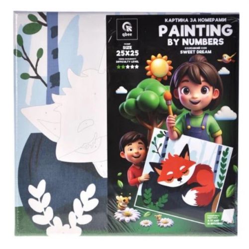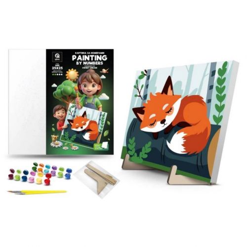 Дитяча картина за номерами. Для того, щоб намалювати картину, необхідно малювати за пронумерованими контурами, які відповідають кольору фарби. У наборі: полотно на підрамнику з галерейною натяжкою, художні нейлонові пензлі, палітра акрилових фарб у контейнерах, деревʼяні деталі підставки для картини. Усі необхідні фарби вже в комплекті та не вимагають змішування. Розмір: 25х25 см. Рекомендовано для дітей старше 5 років.