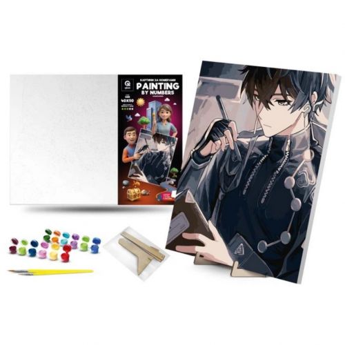 Комплектація: полотно на підрамнику з галерейною натяжкою, художні нейлонові пензлі, палітра акрилових фарб у контейнерах, дерев’яні деталі підставки для картини.