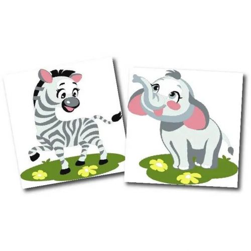 Дитяча картина за номерами на грунтованому ДВП. Зображення просте та складається з доволі великих елементів для зафарбовування. Для того, щоб намалювати картину, необхідно малювати за пронумерованими контурами, які відповідають кольору фарби. У наборі: 2 аркуші ДВП, художній нейлоновий пензлик, палітра акрилових фарб у контейнерах. Усі необхідні фарби вже в комплекті та не вимагають змішування. Розмір кожного малюнку: 15х15 см.