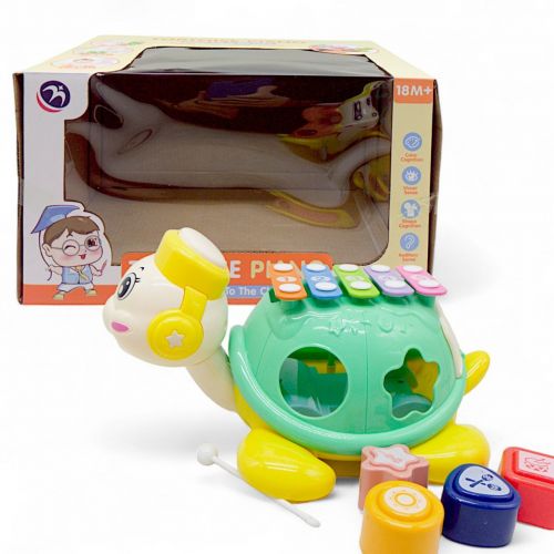 Ігрова каталка у формі черепашки, яка стане чудовим супутником для вашого малюка у процесі його розвитку. Коли дитина тягне за шнурочок, черепашка починає рухатися, а голова її обертається. На спині черепашки розташований ксилофон, який покликаний розвивати музичні навички малюка, а з боків – сортер із геометричними фігурами, що допомагає розвивати моторику рук та знайомитися з формами та кольорами.