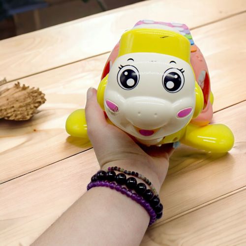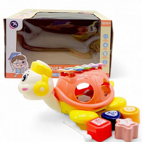 Ігрова каталка у формі черепашки, яка стане чудовим супутником для вашого малюка у процесі його розвитку. Коли дитина тягне за шнурочок, черепашка починає рухатися, а голова її обертається. На спині черепашки розташований ксилофон, який покликаний розвивати музичні навички малюка, а з боків – сортер із геометричними фігурами, що допомагає розвивати моторику рук та знайомитися з формами та кольорами.