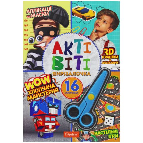 Незвичайна і захоплююча книга саморобок “Актівіті-вирізалочка”. Тут зібрані найцікавіші колекції готових ідей, щоб власноруч зробити саморобки, 3д іграшки, маски, аксесуари, ігри, листівки та інші цікавинки. Створюй круті саморобки весело та просто: вирізай вже готові елементи й послідовно дотримуйся інструкції. Нічого не треба придумувати, або шукати додаткові деталі чи матеріали, просто вирізай – згинай – приклеюй – грайся. Тобі в допомогу зразок-підказка готового виробу, при потребі паперові заготовки можна наклеїти на картон. Ножиці вже є в наборі.