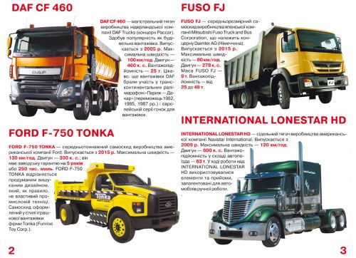 Книга “Вантажні автомобілі”. У книжці описані різні види авто, їх характеристики і особливості. З яскравими ілюстраціями. 17 сторінок, м’яка обкладинка, на українському.