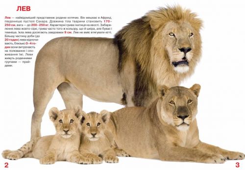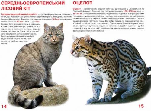 Книга “Велика книга. Дикі кішки”. У ній представлені яскраві ілюстрації з описом і характеристиками різних представників сімейства котячих. 17 сторінок, м’яка обкладинка, на українському.