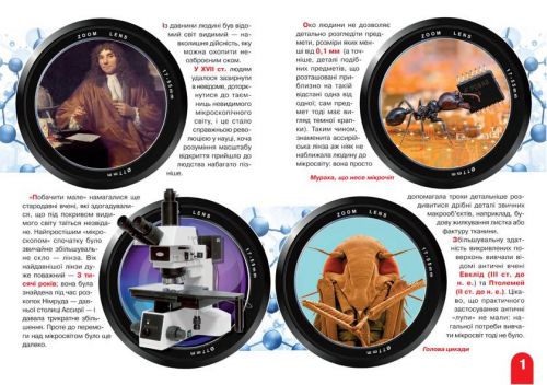 Книга “Велика книга. Мікросвіт”. У ній розказано про винахід і наукового застосування мікроскопа і численних наукових відкриттях, пов’язаних з ним. З яскравими ілюстраціями. 17 сторінок, м’яка обкладинка, на українському.