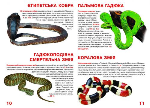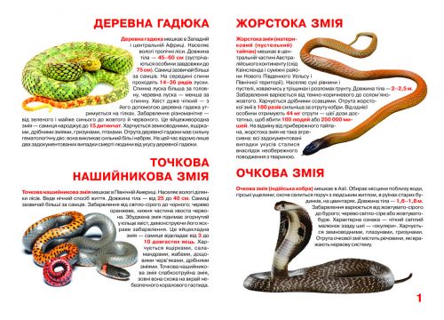 Книга “Велика книга. Отруйні змії”. У ній представлені отруйні змії різних видів, їх характеристики і опис. З яскравими ілюстраціями. 17 сторінок, м’яка обкладинка, на українському.