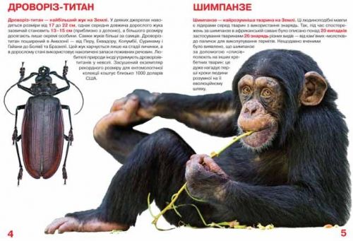 Книга “Велика книга. Рекорди тваринного світу”. У ній ви знайдете інформацію про найбільше сухопутна тварина, саме “зубаті” тварина або саме отруйна. 17 сторінок, м’яка обкладинка, на українському.