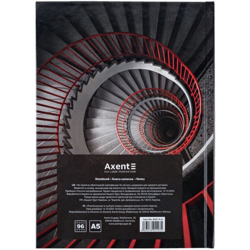 Серія записних книжок Axent Red&Black. Якісний папір щільністю 55г/м2 білого кольору забезпечує комфортне письмо, добре вбирає чорнило. Завдяки твердому переплетенню та міцній обкладинці записна книжка довго буде зберігати презентабельний вигляд. Папір у клітинку, зручно робити будь-які записи, малювати, креслити. Глянцева ламінація на обкладинці. Формат – А5. Кількість аркушів – 96.