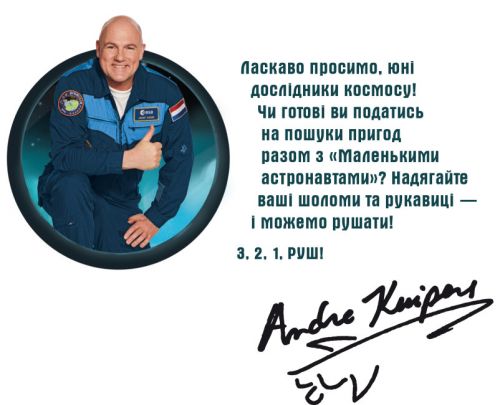 Запуск твоєї ракети відбудеться через 10 днів! За час тренувань у Дитячій космічній академії ти дізнаєшся все про космічні польоти та життя на орбіті, навчишся співпрацювати, виконувати складні завдання, а ще зможеш отримати диплом маленького астронавта! А раптом ні – ракета вирушить без тебе! Це неймовірно і страшенно цікаво. Та найголовніше, що допомагатиме тобі справжній астронавт Європейського космічного агентства, Андре Кайперс, який уже двічі побував у космосі та працював на Міжнародній космічній станції.