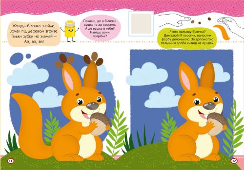 Це книжка для малюка, який ще не тримає в руках пензлика й олівця. З нею юний художник зможе створювати свої шедеври, просто вмочуючи пальчики у фарбу та торкаючись ними сторінок! Щоб йому було легше впоратися, ми зробили картинки великими й розмістили поряд зразки. Наклеюйте наліпки, виконуйте разом із дитиною завдання та розучуйте віршики, щоб розвинути дрібну моторику, пам’ять і мовлення дошкільняти.