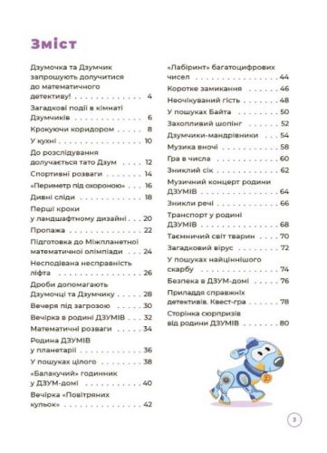 Нумо вивчати математику разом із родиною ДЗУМів, які живуть у сучасному світі поруч із такими незвичними родичами як: Комп-дідусь, Бабуся Флешка, Дядько Коптер, Тітка Камера та іншими друзями-гаджетами. Перед ними постає непроста задача — допомогти маленьким Дзумчику та Дзумочці підготуватися до школи та опанувати 33 перші навички математики.Що будемо вивчати? Цифри й числа від 0 до 10, орієнтування в просторі (попереду – позаду, близько – далеко, ліворуч – праворуч, тощо), геометричні фігури та форми, величину предметів (товстий – тонкий, велике – маленьке, високий – низький тощо), пори року й дні тижня, та ще багато цікавого!