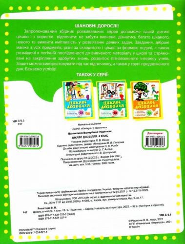Запропонований збірник розвивальних вправ допоможе дитині цікаво та з користю відпочити: не забути вивчене, дізнатись багато цікавого та виявити кмітливість у розвʼязанні деяких задач. Завдання, дібрані майже з усіх предметів, різні за складністю і цікаві за формою подачі, а також розміщені в логічній послідовності до вивченого матеріалу у школі та спрямовані на закріплення здобутих знань та розвиток пізнавального інтересу учнів. Зошит можна використовувати під час відпочинку, у також у групі продовженого дня. Мʼяка обкладинка, 32 сторінки.