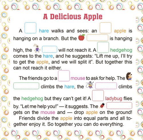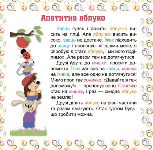 У книзі можна знайти 7 веселих історій. На кожній сторінці знаходиться текст на 2-х мовах: зліва – англійською, а праворуч – українською. В англійському тексті є яскраві наклейки для тренування слів. Спочатку дитина наклеює малюнок поруч зі словом, яке виділено певним кольором в кожному тексті, а коли слово зустрічається ще раз – наклеює слово поруч з малюнком. На сторінці з наклейками це слово виділено тим же кольором. 12 сторінок. Мова: українська та англійська.