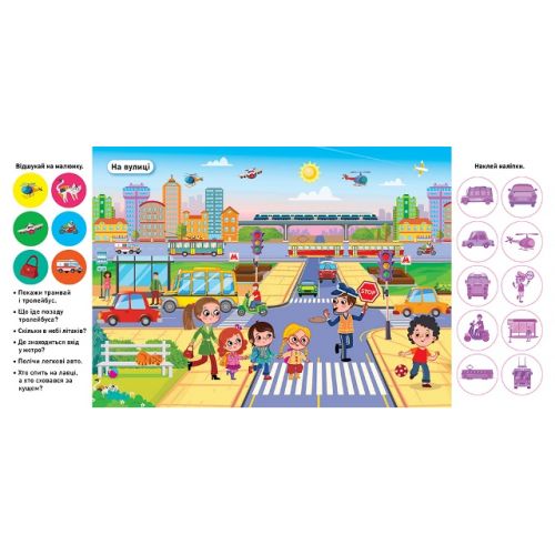 Завдання даної книжки допоможуть дитині розвинути мислення, кмітливість, увагу та дрібну моторику. Малюк відчує себе дослідником, бо шукатиме різні предмети, рослини, тварин, транспорт, наклеюватиме яскраві наліпки. Запропоновані питання допоможуть дитині попрактикувати вміння орієнтуватися в просторі (угорі – внизу; ліворуч – праворуч), повторити кольори, розміри (більший – менший, високий – низький). 10 сторінок + аркуш з наліпками. Мʼяка обкладинка.