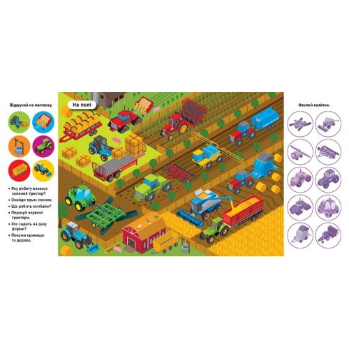 Завдання даної книжки допоможуть дитині розвинути мислення, кмітливість, увагу та дрібну моторику. Малюк відчує себе дослідником, бо шукатиме різні предмети, рослини, тварин, транспорт, наклеюватиме яскраві наліпки. Запропоновані питання допоможуть дитині попрактикувати вміння орієнтуватися в просторі (угорі – внизу; ліворуч – праворуч), повторити кольори, розміри (більший – менший, високий – низький). 10 сторінок + аркуш з наліпками. Мʼяка обкладинка.