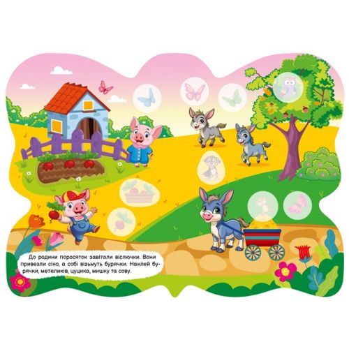 На сторінках даної книжки малюки зустрінуть улюблених тваринок і за допомогою наліпок поринуть разом із ними в дивовижні пригоди. Також яскраві наліпки допоможуть дітям потренувати дрібну моторику, розвинути увагу, уяву, логічне мислення та посидючість. В книжці 8 сторінок. В мʼякій обкладинці.