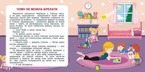 Книжка із серії “Читаємо по складах” містить цікаві повчальні історії (7 оповідань). Текст досить короткий, до 150 слів. Великий шрифт. 12 сторінок в мʼякій палітурці.