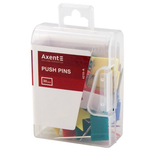 Кнопки-цвяшки призначені для фіксації інформації на пористій поверхні, перш за все пробкових або тканинних дошок. Кнопки мають продовгувату кольорову пластикову шляпку у формі прапорців. Гострота і міцність стрижня кнопки забезпечують легку надійну фіксацію. Довгаста форма шляпки дозволяє зручно тримати кнопку в руці. 30 шт. в пластиковому контейнері.