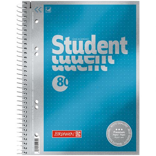 Коледж-блок BRUNNEN Premium А5 формату на спіралі виготовлений з європейського високоякісного білого паперу 90 г/м2. 80 аркушів у крапку. Папір стійкий до чорнила. Сторінки з мікроперфорацією для легкого відривання. Додаткова перфорація на 6 отворів для кріплення у папках. Колір: вишуканий блакитний з металевим ефектом.