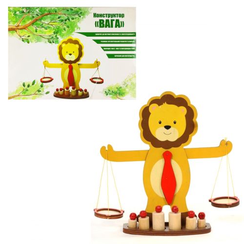 Ігровий набір конструктор-ваги зроблений з фігуркою у вигляді лева. За допомогою цієї гри дитина розвиває логічне мислення та уважність, інтелект, пам’ять, дрібну моторику рук, координацію. Терези є діючими. Виконані з дерева. Розмір іграшки у складеному вигляді 25х20х6 см.