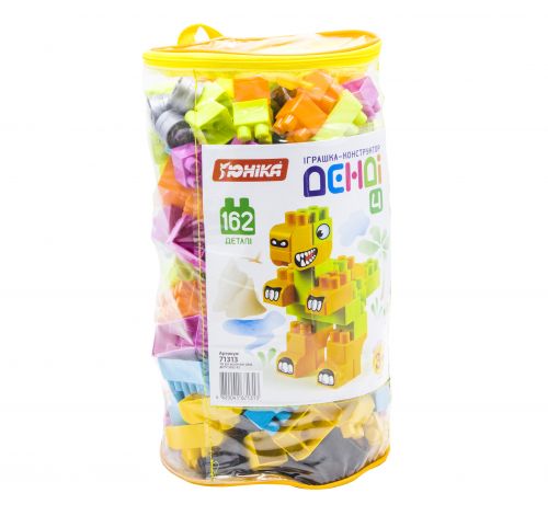 Конструктор “Денді – 4”, 162 деталь. Великі деталі. Можна будувати будиночки, дороги, гаражі, тварин, роботів, монстрів, машинки і багато іншого. Колеса з гумовими шинами. Корисний для моторики рук, інтелекту, уваги і творчого потенціалу.