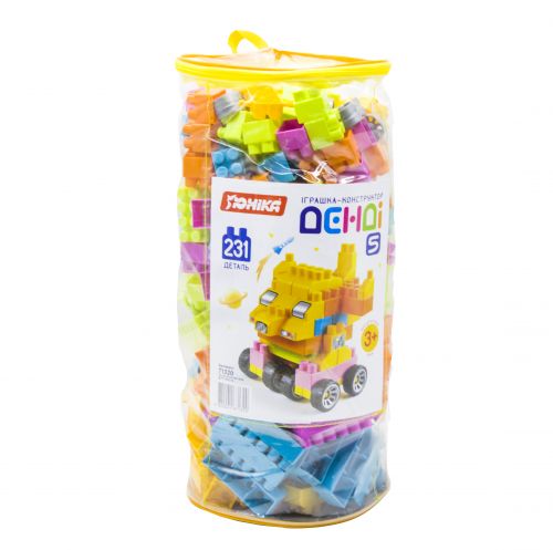Конструктор “Денді – 5”, 231 деталей. Великі деталі. Можна будувати будиночки, дороги, гаражі, тварин, роботів, монстрів, машинки і багато іншого. Колеса з гумовими шинами. Корисний для моторики рук, інтелекту, уваги і творчого потенціалу.