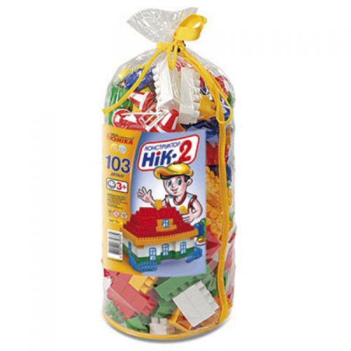 Пластиковий різнокольоровий конструктор “НИК-2” на 103 деталі. З деталей можна побудувати будиночок з окнамі.В комплект також включені наклейки і машинки.