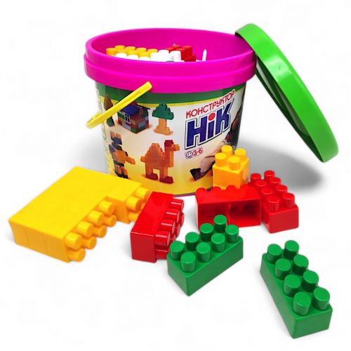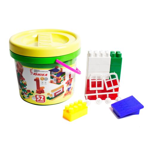 Яскравий пластиковий конструктор на 52 деталі. Крім звичайних блоків набір складається з деталей для будівництва машинки, будиночка та кількох дорожніх знаків. Як упаковка – пластикове відерце з ручкою.