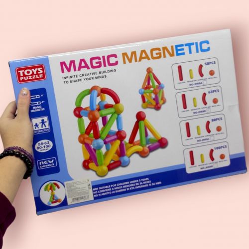 Цей магнітний конструктор – чудова іграшка для розвитку творчих здібностей дітей. Завдяки вбудованим магнітам елементи легко збираються і тримаються разом, тому будувати великі споруди, такі як вежі, дуже просто. У набір входять 4 типи будівельних блоків – довга паличка, коротка паличка, вигнута паличка і металева кулька (яку можна використовувати для зʼєднання декількох різних паличок). У комплекті також є брошура з декількома готовими конструкціями, які ваша дитина може зібрати самостійно.