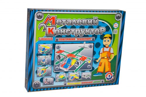 Конструктор металевий “Повітряний трансопорт”. 191 деталь в комплекті (гвинтики, планки, гайки, вилки, кермо, колеса, ключі, викрутка і ін.). 8 різних моделей для збирання: літак, – вертоліт (модель №1), – винищувач, – аероплан, – гідроплан, – вертоліт (модель №2), – літак (модель №2), і т.д. Покрокова інструкція.