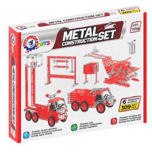 Конструктор металевий “Пожежна техніка”. 309 деталей в комплекті (гвинтики, планки, вилки, кермо, колеса, ключі, викрутка і ін.). Покрокова інструкція