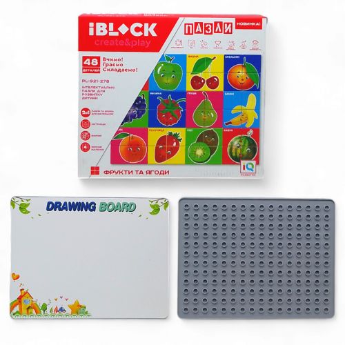 Пазл з дошкою для малювання “2в1” має великі деталі, які підійдуть маленьким дітям для вивчення предметів, кольорів та для тренування дрібної моторики. У комплекті є 48 деталей пазла, двостороння дошка (одна сторона для малювання маркерами, а друга для збирання конструктора) та 2 маркера.