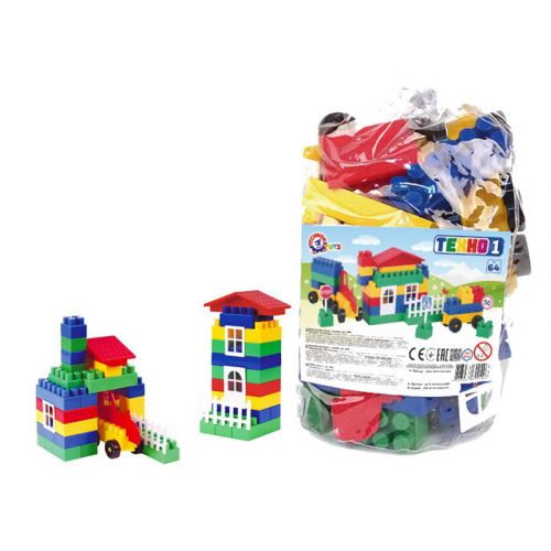 Пластиковий конструктор на 64 деталі. Можна збирати будиночок і машинки, в наборі також є дорожні знаки та наклейки.