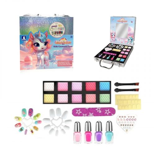 Комплектація: 0 кольорів тіней для повік, 4 кольори лаків для нігтів, 1 пилка для нігтів, накладні нігті та клейкі смужки, наклейки для дизайну, аплікатори для тіней, дзеркало у валізці
