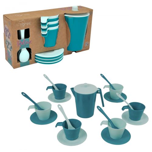Яркий кавовий набір з поліпропілену. В комплекті: 6 чашок, 6 ложечок і кавник. Розмір однієї чашечки: 5х5 см. Розмір кавник: 11х9 см. Для дітей віком від одного року.