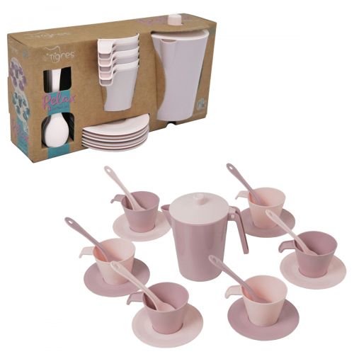 Яркий кавовий набір з поліпропілену. В комплекті: 6 чашок, 6 ложечок і кофейник. Розмір однієї чашечки: 5х5 см. Розмір кофейника: 11х9 см. Для дітей віком від одного року.