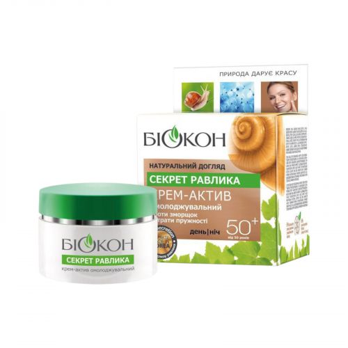 Крем-актив омолоджувальний «Секрет равлика» із серії «Натуральний догляд» — проти зморщок і втрати пружності.Інтенсивно зволожує шкіру, живить корисними речовинами. Містить високу концентрацію фільтрату слизу равлика гігантського (Achatina fulica), який надає на шкіру комплексну дію. Сприяє зменшенню глибини зморщок і їхньому розгладженню, запобігає появі нових зморщок. Створює умови, необхідні для відновлення й самоомолодження шкіри, сприяє уповільненню процесів старіння.