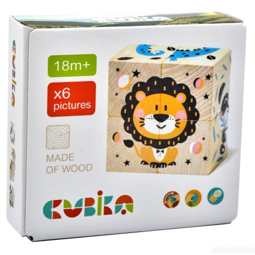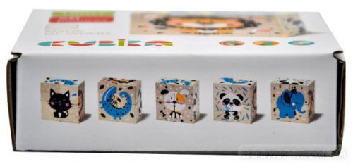 Кубики українського виробництва, еко-іграшка із карпатського дерева для дітей від 18 місяців. Дуже якісні, міцні, яскраві та безпечні, забарвлені якісною фарбою. 4 кубики. Розмір одного – 3,5 см. 6 картинок з тваринами: лев, кішка, крокодил, собачка, панда та слон.