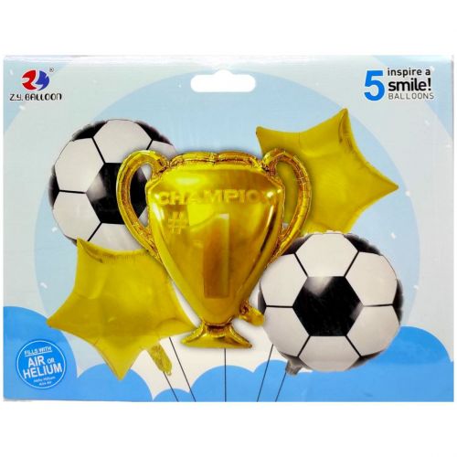 Яскравий набір кульок “Футбол”. Милий та барвистий комплект. У наборі 5 фольгованих кульок: 1 велика кулька у вигляді переможного кубку, 2 з футбольними мʼячами, та 2 зірки. Всі кульки якісні та надійні. Принесуть безліч позитивних емоцій імениннику та гостям на святі!
