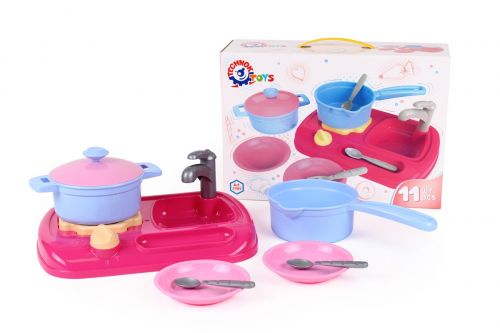 Кухня складається з поверхні з газовою конфоркою іграшкова мийка з краном і рухомою ручкою. У наборі: кухонна стільниця, кран, каструля, сотейник, кришка, ложки, вилки і тарілки по 2 шт.