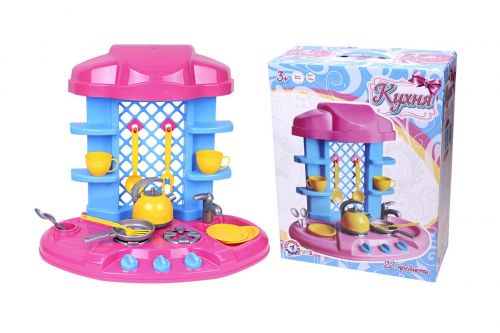 Іграшка “Кухня 6 ТехноК”. У набір входить 22 елемента, в тому числі набір іграшкової посуду на дві персони з чайника, чашок і тарілок, а також кухонних приладів.