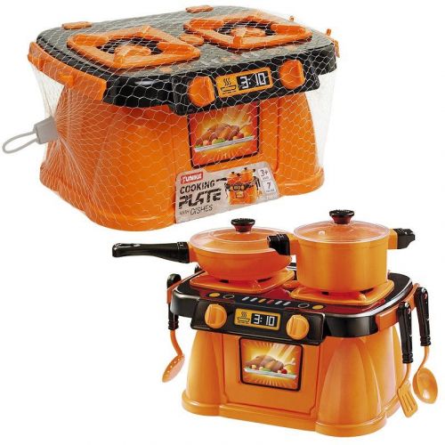 Іграшкова кухня з посудом у контейнері, який трансформується у плиту з духовкою. У комплекті є каструля, сковорідка, лопатка, ківш, друшляк та вилка для риби. Набір виконаний з якісних та міцних матеріалів. Для дітей віком від 3-х років.