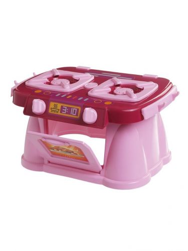 Яскравий кухонний набір з плитою та безліччю аксесуарів для готування. У комплекті є лопатка, ківш, друшляк, виделка для риби, каструля та сковорідка. Плита виконана у вигляді коробки, що дозволяє складати дрібне приладдя всередину. Ручки на плиті обертаються. Розмір – 26х19х16 см. Виконано з міцного пластику.