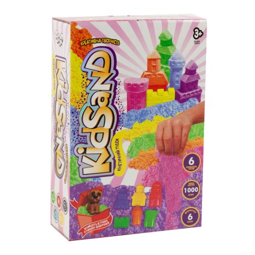 Кінетичний пісок “KidSand” з формочками 1000 р 6 кольорів. Такий пісок прекрасно тримає будь-яку форму, швидко розпадається при необхідності, а його будова відрізняється одночасно пористістю і міцністю. За відчуттями такий пісок нагадує сирий морський пісок, тільки він без води, не прилипає до рук, не забруднює одяг. У комплекті з піском йдуть 6 формочок і фігурка собачок.