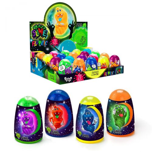 Слайм складається з вузького матеріалу, який можна розтягувати, стискати і надувати. Може стрибати як справжній стрибунець. Світиться в темряві. Ціна за баночку (20 в коробці).